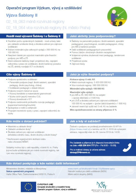 Cílem výzvy je podpořit mateřské, základní a základní umělecké školy a školská zařízení pro zájmové vzdělávání (střediska volného času, školní družiny a školní kluby) formou projektů zjednodušeného vykazování.